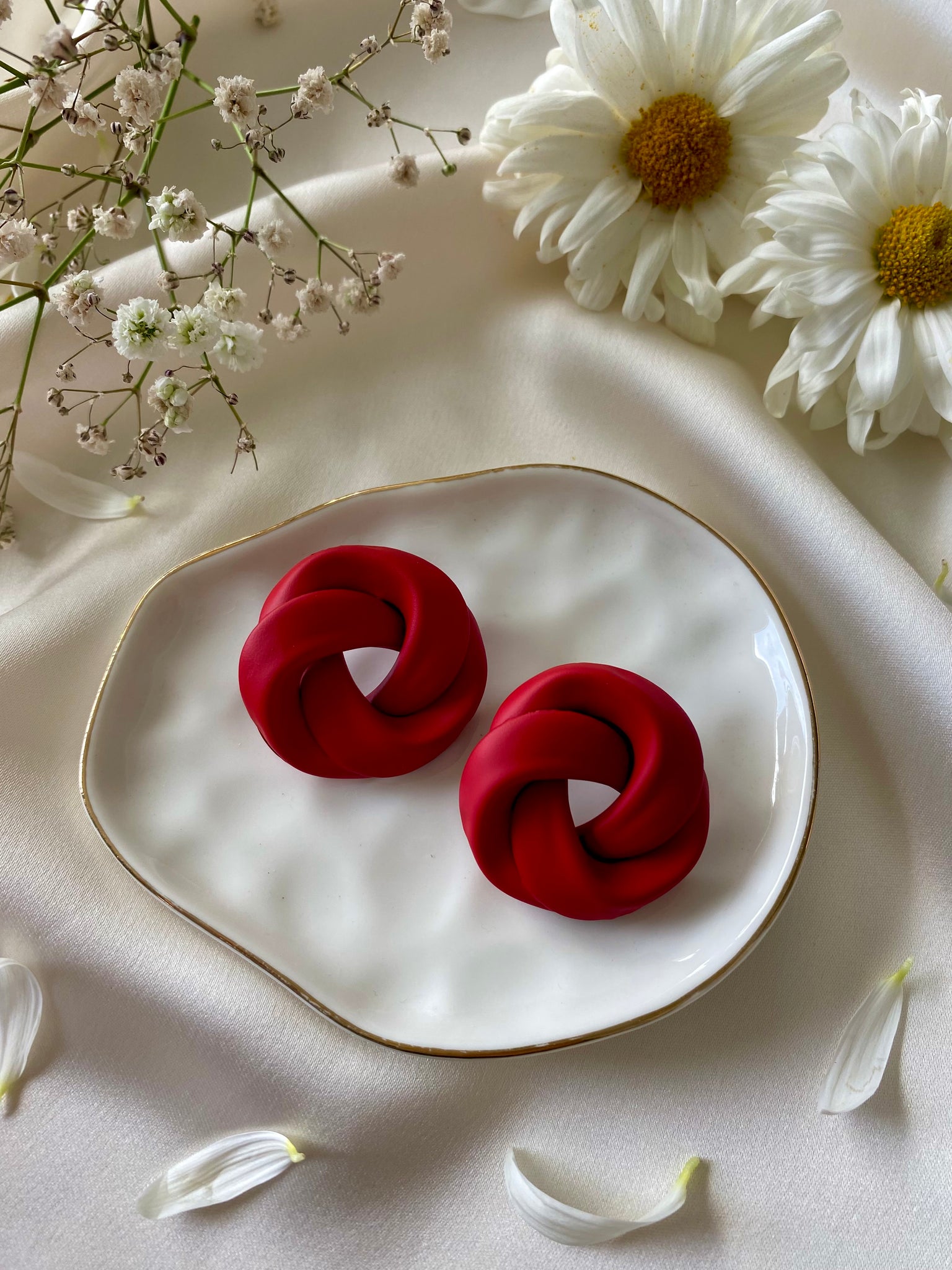 Estos aretes rojos con diseño de nudo, de aproximadamente 3.5 cm, son el complemento perfecto para elevar cualquier look. Su color los hace llamativos y su estilo realzará tu estilo en cualquier ocasión. Atrévete a destacar con los Aretes Adriana.