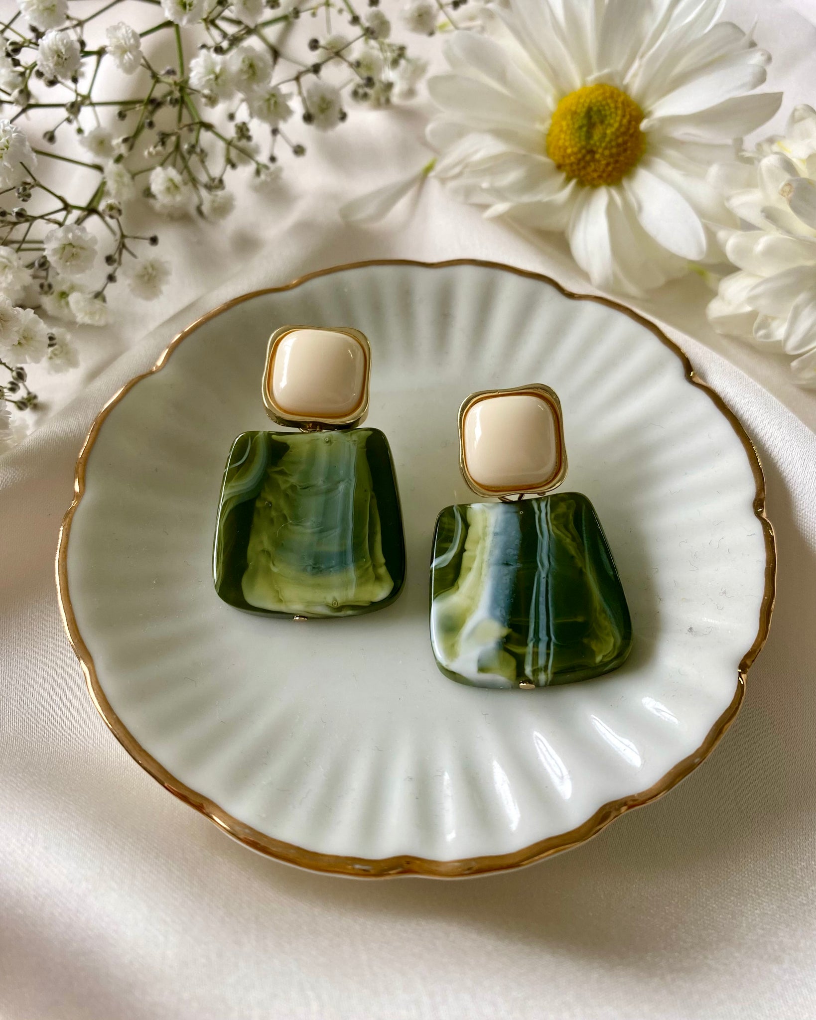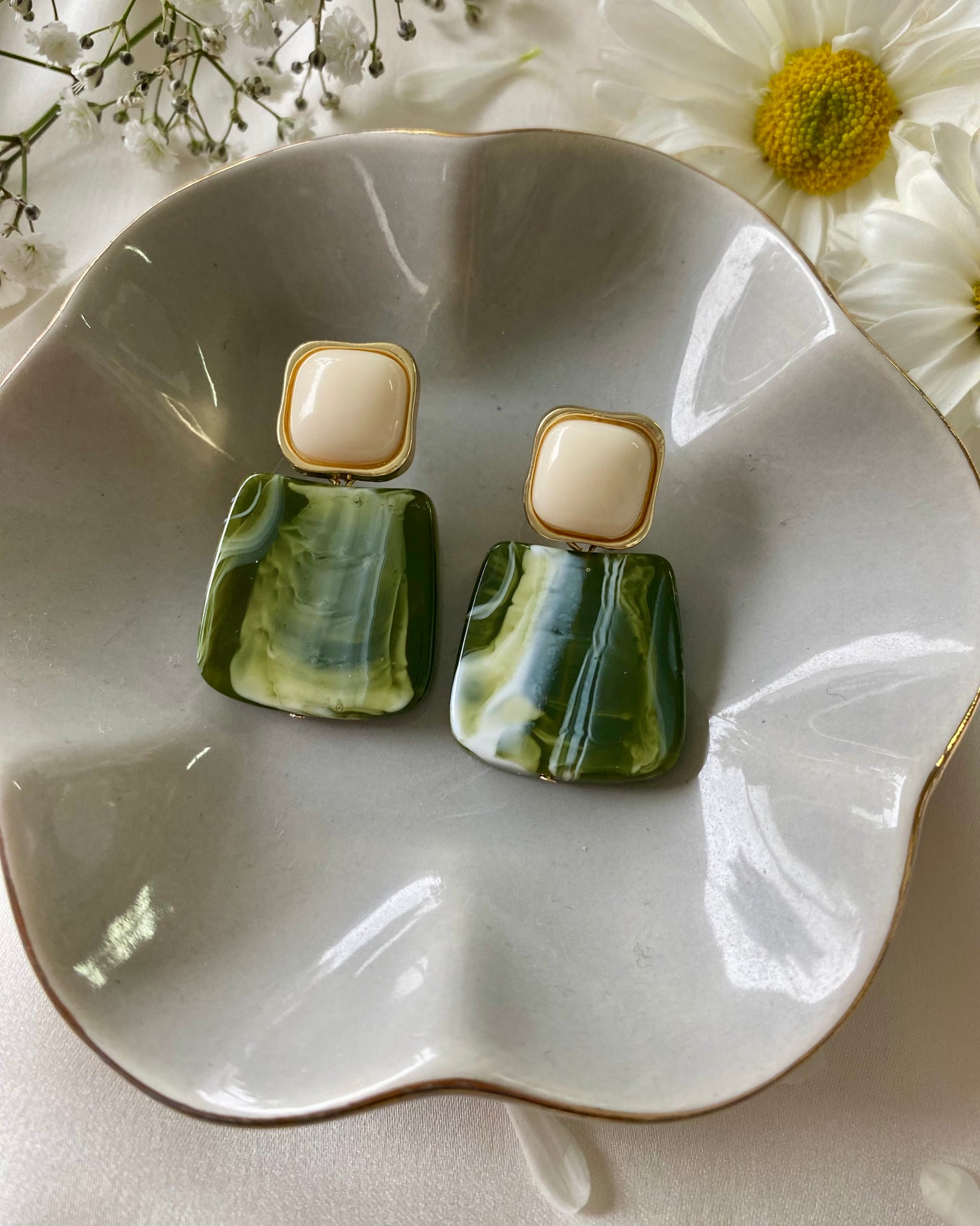 Los aretes Alia combinan piedras de acrílico en tonos beige y verdes, creando un accesorio único que realza cualquier look. Con una medida aproximada de 4.5 cm, son el toque perfecto para destacar tu estilo con delicadeza y frescura.