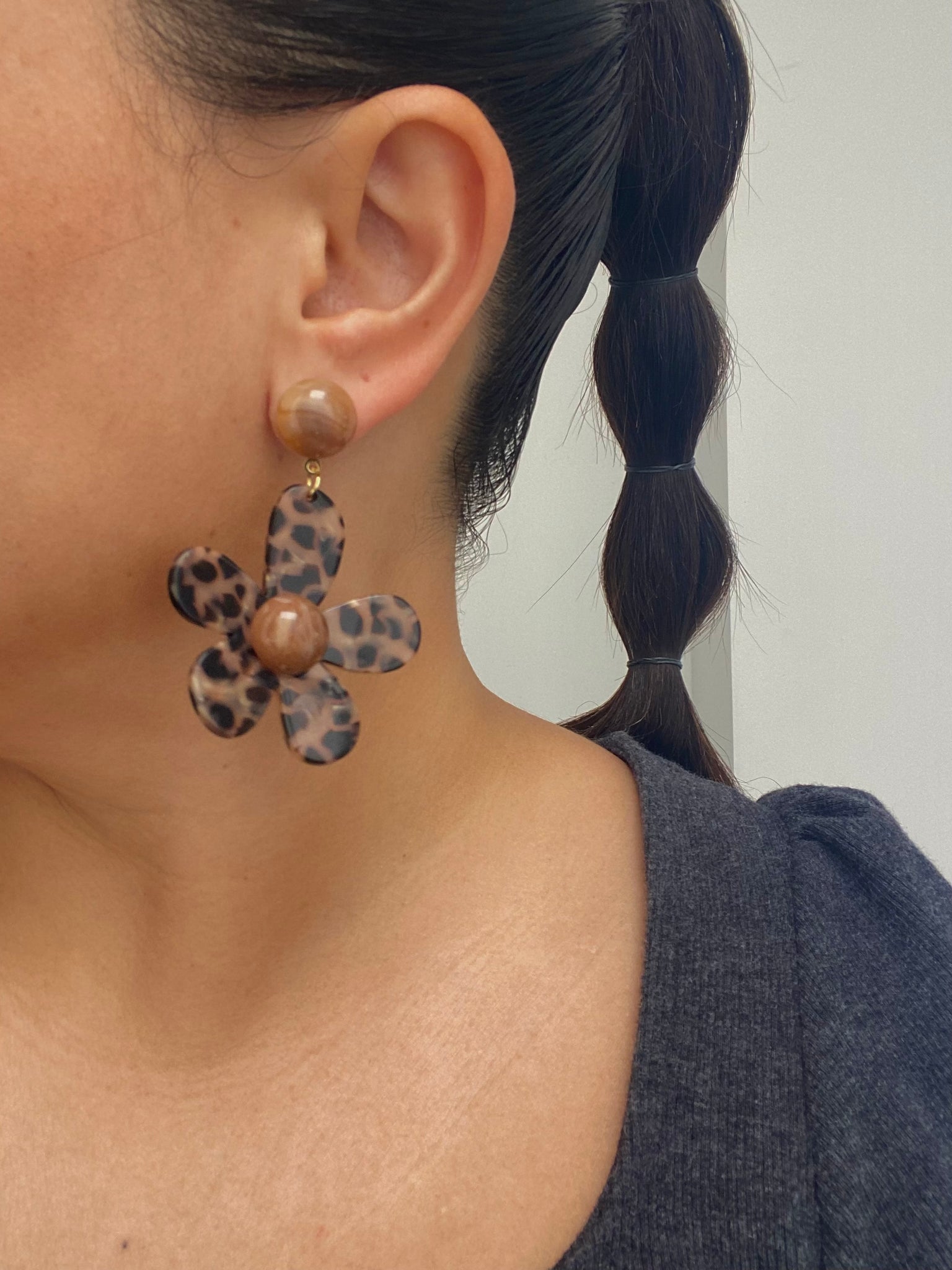 Los aretes Dalmi, en forma de flor y con un diseño animal print, son el accesorio perfecto para destacar tu estilo único. Son fabricados en acrílico y miden aproximadamente 6 cm. Añade un toque audaz y moderno a cualquier outfit con estos aretes que reflejan tu personalidad vibrante.