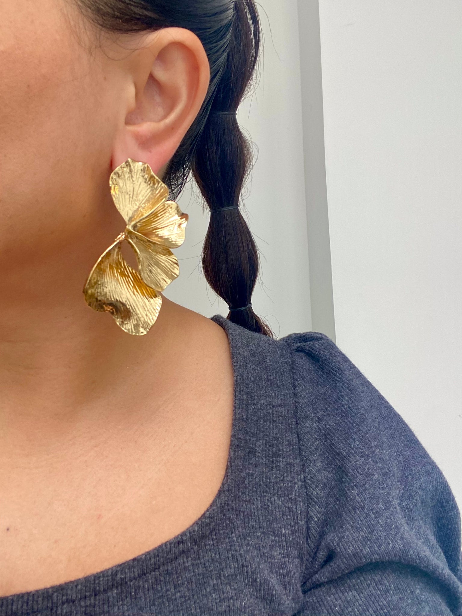 Estos aretes dorados en forma de media flor, con un tamaño aproximado de 7 cm, aportan un toque elegante y sofisticado a cualquier look. Su diseño resalta tu feminidad mientras que su acabado dorado garantiza un brillo duradero. Perfectos para ocasiones especiales o para fiestas. ¡Haz que cada detalle hable por ti con los Aretes Galicia!
