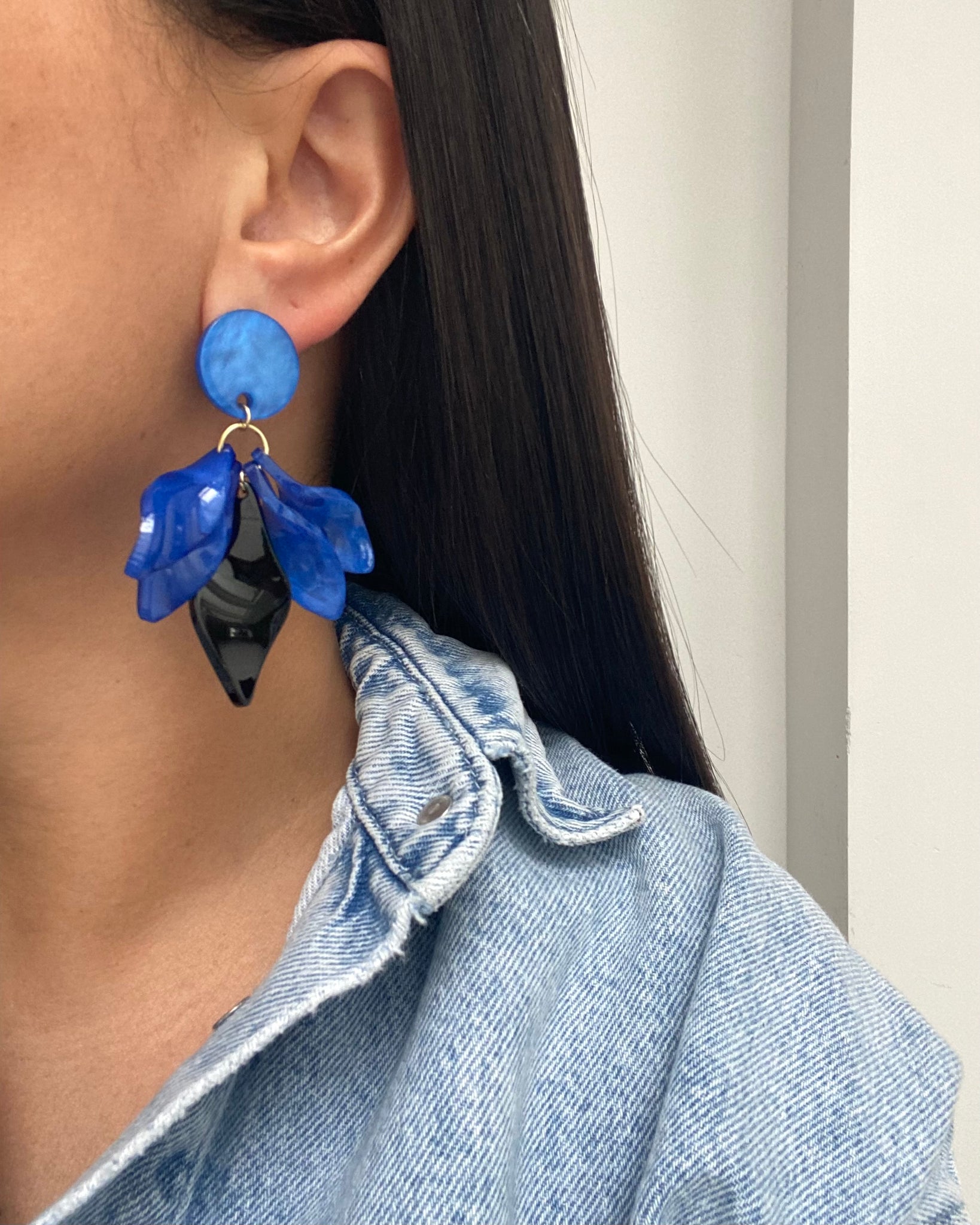 Los aretes Kaia, de acrílico azul intenso, combinan elegancia y frescura con su diseño en forma de flor. Con un tamaño aproximado de 7 cm de largo, son el accesorio ideal para destacar cualquier outfit con un toque vibrante y sofisticado. Perfectos para quienes buscan un estilo único y lleno de personalidad.